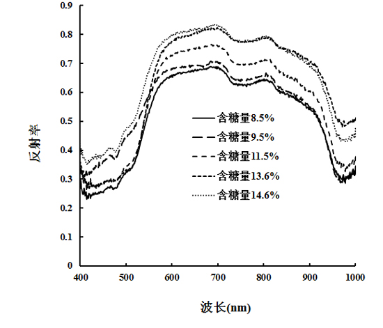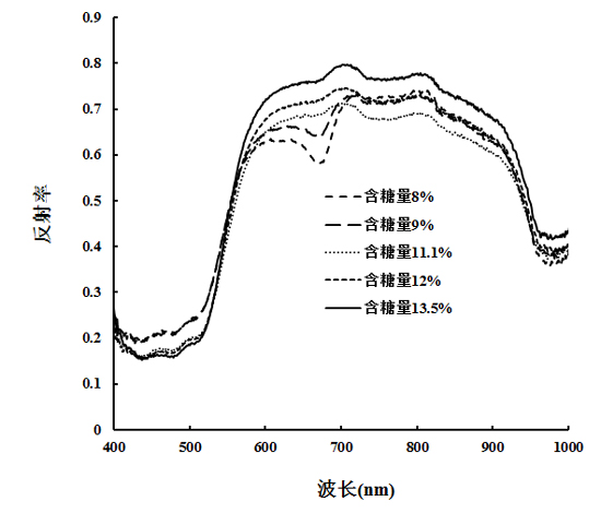 图4为黄色甜瓜不同含糖量的光谱曲线图,从图中可知,随着含糖量的升高在可见光、近红外区间其光谱反射率呈增加的趋势。在410-600 nm 区间反射率上升速度较快;在600-680 nm区间反射率上升缓慢;在680-720 nm区间缓慢下降;在720-800 nm处呈上升趋势;到了800 nm后,光谱反射率呈下降趋势;与西瓜瓜瓤相似,在700 nm和800 nm附近有2个峰值,与西瓜一样,这也是由于甜瓜的有机分子中含氢基团振动的合频、各级倍频的吸收作用引起的。总体而言,黄色甜瓜糖度不同,其光谱曲线差异显著。