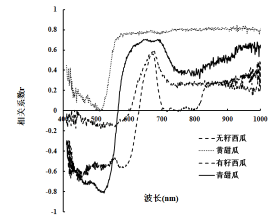图7为不同水果的糖度与各波段反射率的相关系数图。从图中可知,四种不同品种的水果,其光谱反射率对糖度的响应差异较大。对两个品种的西瓜而言,无籽西瓜在400-600 nm范围内,其光谱反射率与含糖量呈负相关关系,在600-1000 nm范围内,其光谱反射率与含糖量呈正相关关系,其中600 nm处为零界点;有籽西瓜在400-630 nm范围内,其光谱反射率与含糖量呈负相关关系,在620-700 nm与820-1000 nm范围内,其光谱反射率与含糖量呈正相关关系,在700-820 nm范围内,其光谱反射率与含糖量相关性较小,接近为0;在660 nm附近,有籽和无籽西瓜的光谱反射率与含糖量形成一个峰值,因此,660 nm可作为西瓜瓜瓤对糖度的一个特征响应波段。而对于两个品种的甜瓜,黄色甜瓜的光谱反射率与糖度在400-1000nm范围内呈正相关关系,但在520 nm附近出现一个谷值,该谷值为0,即与糖度相关性为0;在550-1000 nm范围内,黄色甜瓜的光谱反射率与糖度相关性较为稳定,保持在0.8左右;青色甜瓜在400-570 nm范围内,其光谱反射率与含糖量呈负相关关系,在570-1000 nm范围内,其光谱反射率与含糖量呈正相关关系,与黄色甜瓜类似,在520 nm附近出现一个谷值,该谷值为0.8,即相关系数为0.8;青色甜瓜的光谱反射率与含糖量的零界点在570 nm,即相关系数为0。
