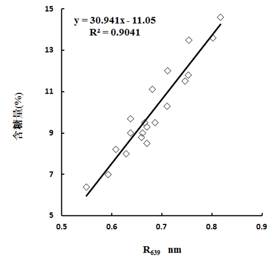 图9为两种西瓜、两种甜瓜在639.3 nm处的光谱反射率与其糖度的散点分布图。根据散点图的分布进行线性拟合,其一次线性拟合的模型为:y=30.941x-11.05,决定系数R2为0.904。