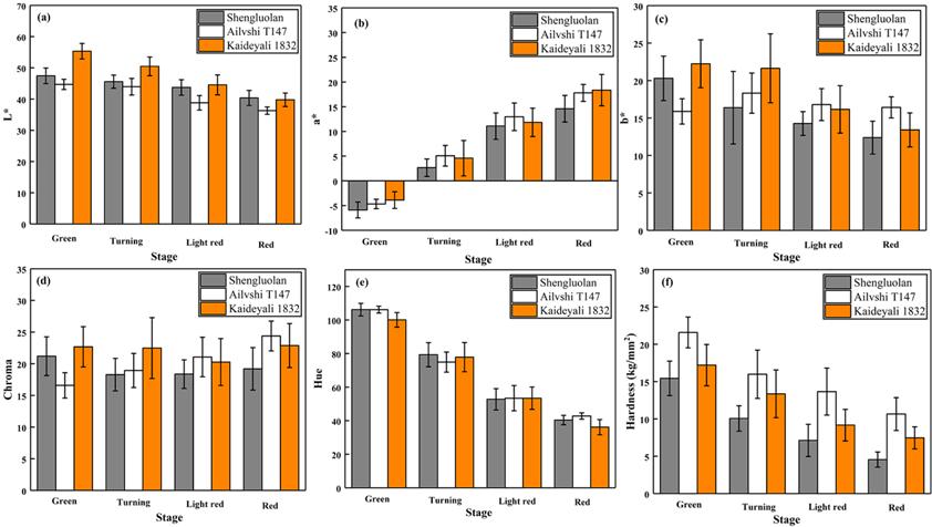 在番茄的品质检测中,大多数检测是针对单一品质指标,很少能同时检测番茄的综合品质。本研究为寻找可表示番茄综合品质的指标,采用可见光和近红外(Vis-NIR)高光谱成像技术,分别在绿熟期、转色期、成熟期和晚熟期,对3个常栽番茄品种(‘圣罗兰’、‘凯德雅丽1832’和‘爱绿士T147’)的果实进行了图像采集,并测定了其中的12个品质指标:果实的颜色指标(L*、a*、b*、色度值、色调值、a*/b*)、硬度、番茄红素、可溶性固形物、可溶性糖、有机酸和VC含量作为参考标准。