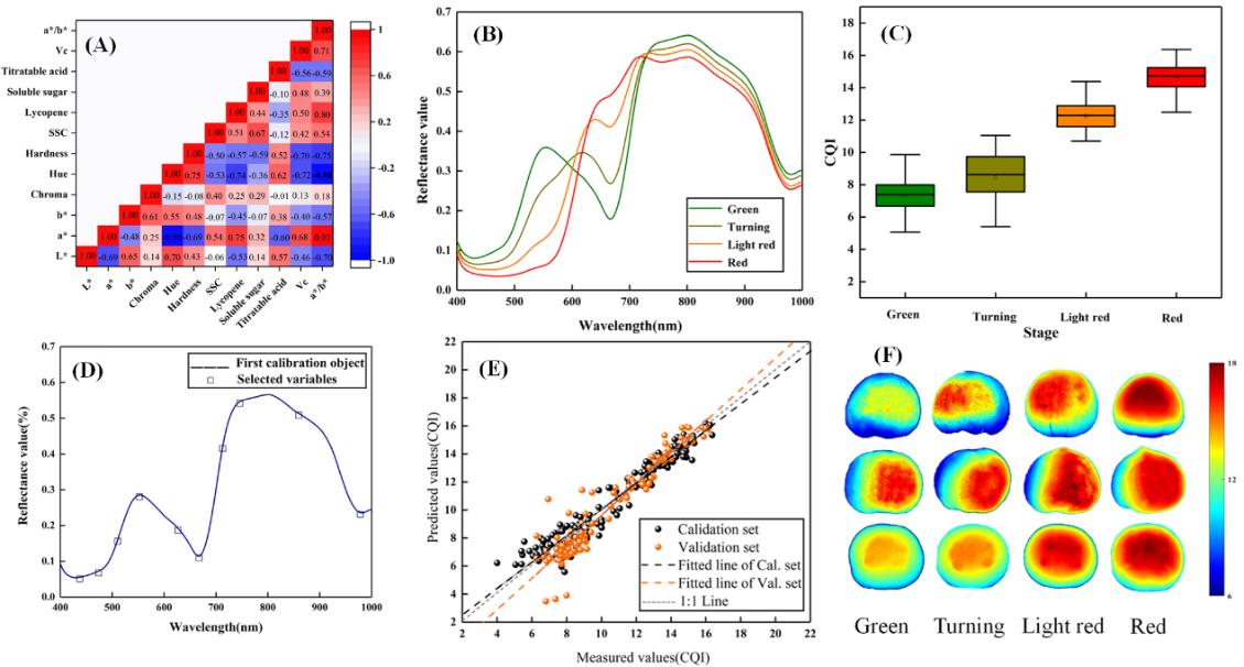 最后通过连续投影算法选择特征波长,用于建立CQI预测的三个回归模型。结果表明,多元线性回归(MLR)模型RV2= 0.87,RMSEV = 1.33,RPD = 2.58取得了良好的性能。本研究表明,基于高光谱成像和化学计量学技术,可以无损预测番茄的综合品质,为番茄果实的最佳采收期的确定、果实分级、运输、贮藏和保鲜提供了技术支持。本研究提出的综合品质指标(CQI)不仅综合了番茄果实的内外部品质指标,而且与番茄的成熟度具有一定的关联性。