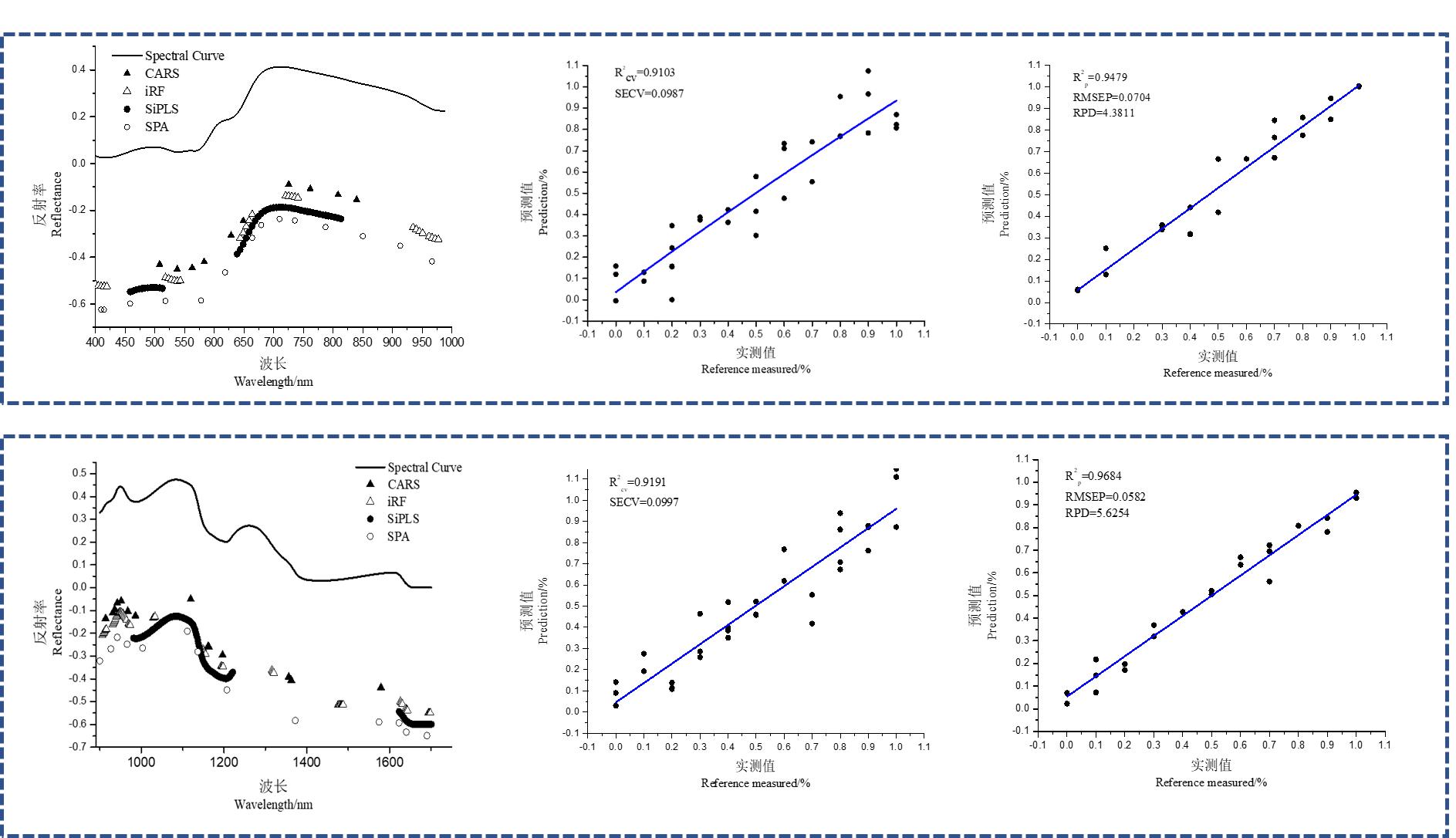 首先对全光谱进行预处理后建模,如表1,表2所示,对于400~1000nm波段范围的光谱,采用归一化预处理后建模效果*好,对于900~1700nm波段范围的光谱,采用SNV预处理后的光谱建模*好。