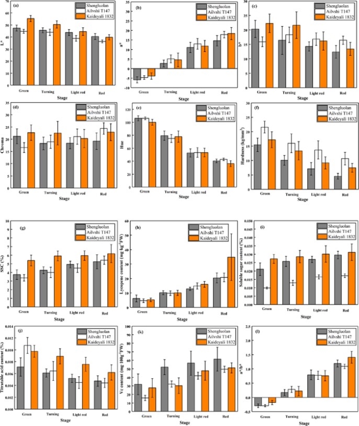 图1 番茄品质指标的变化:(a)L*;(b)a*;(c)b*;(d)色度;(e)色调;(f)硬度;(g)SSC;(h)番茄红素含量;(i)可溶性糖含量;(j)可滴定酸含量;(k)VC含量;(L)a*/b*。