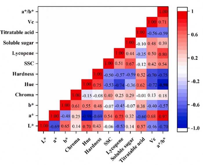 在采集光谱后,使用色差计测量色差值(L*,a*,b*,色度、色调)。数字水果硬度测试仪被用来测量西红柿的硬度。用榨汁机研磨并提取过滤番茄果肉,将所得番茄汁滴在ATAGOBrix计的棱镜板上,测量可溶性固溶体含量(SSC)。以无水乙醇、无水甲醇、石油醚和2%二氯甲烷为萃取剂,从未过滤的全番茄酱中提取番茄红素。利用蒽酮硫酸比色法测定可溶性糖,碱性滴定法测定可滴定酸。采用2,6-二氯吲哚酚滴定法测定维生素C含量。