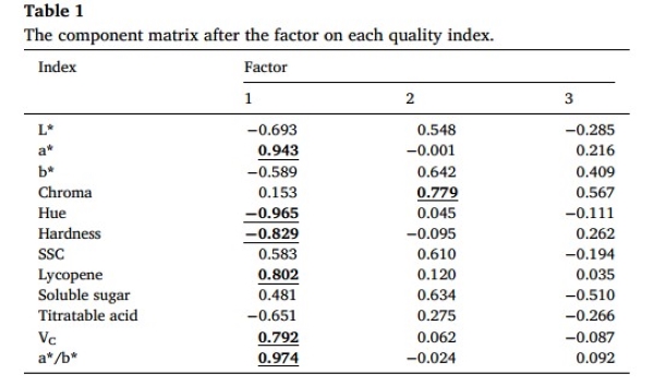 最后,为了更好地解释质量指标与前三个因子的关系,通过因子分析得到了载荷值(表1)。这表明每个指标在前三个因子中的重要性。*一个因子主要反映了a*值、色调、硬度、番茄红素、a*/b*值和维生素C的质量特性,这些指标的绝*值较大。色度在第二个因子中具有*大的正载荷权重,发挥了决定性的作用。相比之下,在第三个因子中没有任何一个指标占据主导地位。通过因子分析后,选择了七个主要指标用于番茄综合评价,包括a*值、色度、色调、硬度、番茄红素、维生素C和a*/b*值。正负载荷值分别分配给分子和分母,进而提出了一个综合质量指数(CQI)。