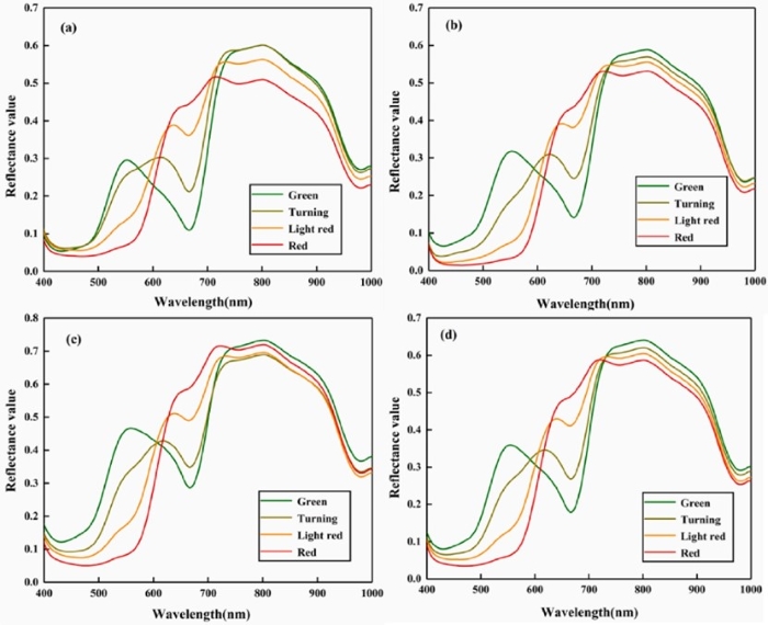图3 番茄在绿色、混色、淡红色和红色时的平均光谱曲线。(a)‘Shengluolan’;(b)‘AilvshiT147’;(c)‘Kaideyali1832’;(d)三个品种的混合平均光谱