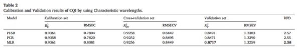 基于综合质量指数(CQI)和特征波长,分别建立了PLSR、PCR和MLR的综合质量预测模型。表2显示了PLSR、PCR和MLR模型的校准、交叉验证和验证性能。各模型均获得了满意的性能,R2C接近于1,RPD大于2.5。比较R2V和RMSEV的值,MLR的预测效果*好,R2V=0.87,RMSEV=1.33,RPD=2.58。本研究提出的新质量指标(CQI)考虑了更多的质量信息,可以应用于水果的综合评价。结果表明,利用高光谱成像技术对番茄品质进行无损预测,对番茄高*栽培和采收具有重要的指导意义。