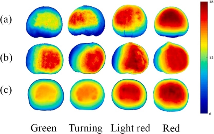 为了可视化番茄在整个成熟过程中的综合质量,使用了预测性能更优的多元线性回归(MLR)模型,并将多变量分析的校准结果应用到图像的每个像素点上。图4显示了根据图像右侧颜色标尺对番茄每个像素的预测CQI值。颜色从蓝色到红色变化,红色表示更高的CQI值。随着番茄成熟阶段的不同,伪彩图上的红色逐渐增加,表明质量随着成熟度的提高逐步增加。此外,番茄样品中的颜色变化还表明CQI值的分布不均匀。