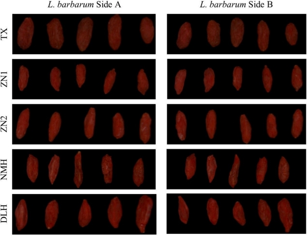 宁夏地区的枸杞样品于2022年6月下旬至7月上旬采收,青海地区的样品则于2022年9月完成采收。不同产地和品种的枸杞均采用人工手工采摘的方式,从每棵枸杞树的东、南、西、北四个方向分别采摘,以保证采样的全*性。为确保数据分析的一致性并减少潜在偏差,每个产地的样品经过严格筛选,尽量保持大小均匀。采摘完成后,枸杞在自然条件下日晒干燥数日。最终共获得525份样品(每个产地n=105)。样品的两面分别标记为A面和B面,其RGB图像如图1所示。随后,所有样品均迅速冷冻保存于-80°C环境中,以保持其生化和物理特性。