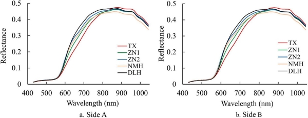 图2.来自不同地理和品种产地的枸杞样品的(a)A面和(b)B面平均反射光谱