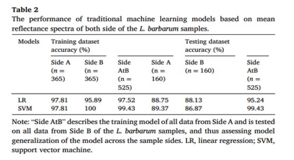 尽管不同地理来源或品种的枸杞在光谱上存在差异,但不能通过视觉比较来有效区分。此外,相似的颜色和形状增加了视觉区分的难度。因此,选择合适的分类策略对其进行准确分类就变得至关重要。为了获得更好的分类结果,本研究采用了机器学习技术。表2显示了线性(LR)和非线性(SVM)模型对枸杞地理来源识别的分类结果。在A侧和B侧的测试数据集上,LR和SVM模型对枸杞产地的分类准确率均未超过90%,但当使用一侧数据训练的模型对枸杞产地进行识别时,LR模型和SVM模型的预测准确率分别达到95.24%和99.43%。总体结果表明,机器学习结合HSI技术有效地识别了枸杞的起源。此外,通过从枸杞的任何一侧收集HSI数据,可以实现可靠的地理来源追溯。