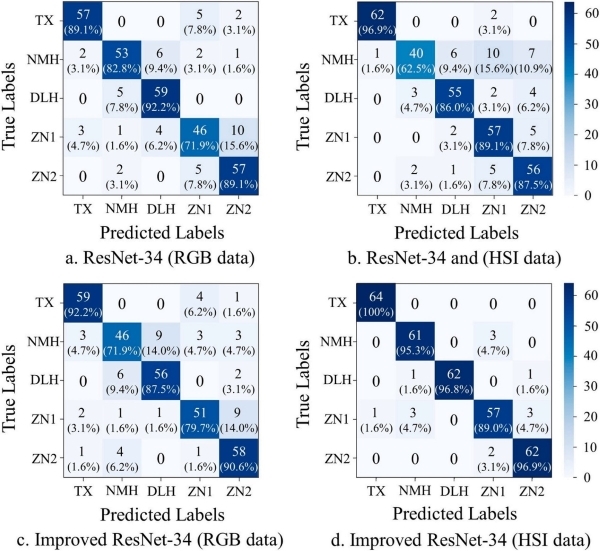 考虑到LR和SVM模型的分类准确率不足90%,引入深度学习对高维HSI数据进行进一步分析。正如之前的研究所指出的那样,深度学习模型需要大量的训练数据集。因此,我们将来自枸杞两侧的HSI数据纳入了包含730个样本的训练数据集和包含320个样本的测试数据集。为了避免同一枸杞样品的A面或B面被分配至不同的数据集(从而影响验证结果的完整性),同一样品的两面被策略性地分配至相同数据集。基于RGB图像和全光谱HSI数据构建的ResNet-34与改进版ResNet-34模型的混淆矩阵分别展示于图3a和b及图3c和d中。矩阵对角线上的值表示正确分类的样本数和真实阳性率,而非对角线上的值则对应误分类样本数和假阴性率。值得注意的是,当以HSI数据为输入时,改进版ResNet-34模型在所有产地(TX、NMH、DLH、ZN1和ZN2)中实现了95.63%的最高分类准确率。这一结果较传统机器学习方法(LR和SVM)提高了6.26%。这一性能提升归因于HSI数据提供的丰富空间和光谱信息。改进版ResNet-34模型中3D和2D卷积层的结合,能够有效利用光谱和空间特征图,从而*大化模型的预测准确性。