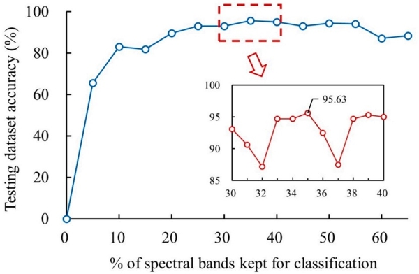 总的来说,改进的ResNet-34模型在基于起源的五种不同类型的枸杞分类中显示出较高的准确性。然而,通过3D卷积运算利用全谱HSI数据增加了计算需求和复杂性。此外,深度学习模型固有的“黑箱”特征在可解释性方面提出了挑战。为了减少信息冗余并提高模型的可解释性,我们使用SHAP来识别HSI数据中对地理起源识别贡献*大的光谱带区域。SHAP值代表了每个光谱波段对模型预测能力的贡献。对枸杞地理来源分类有重要贡献的光谱波段主要从633 nm延伸到1040 nm。随着光谱波段的增加,该模型对枸杞地理来源的识别精度逐渐提高(图4)。实际上,在保留35%的光谱波段(n = 39)的情况下,该模型的分类精度仍然保持在95.63%的高水平,与全光谱HSI数据的分类精度相当。光谱波段的减少也导致运行时间减少29.9%。该方法不仅有效地提高了处理速度,而且提高了产地识别的效率,在准确性和计算效率之间取得了平衡。