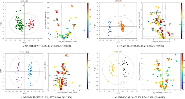 图5. 基于枸杞NMR数据的OPLS-DA评分图(左图)和相应的火山图(右图)