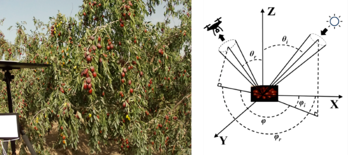 (Ma et al., 2024)基于无人机(UAV)多光谱技术,提出了一种用于检测红枣果实水分含量(MC)和可溶性固形物含量(SSC)的无损检测方法。研究利用DJI Phantom 4 RTK UAV搭载的多光谱相机,采集了不同相对方位角下的红枣多光谱数据,并采用偏最小二乘回归(PLSR)和支持向量机(SVM)构建了预测模型。研究发现,90°相对方位角下获取的多光谱数据在MC预测中效果***,而180°相对方位角下的数据则在SSC预测中表现***。