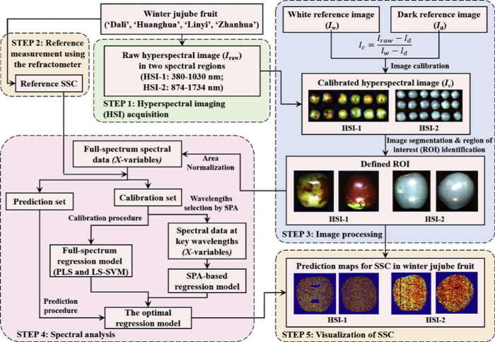 (Zhao et al., 2020)探讨了高光谱成像技术(HSI)在冬枣果实可溶性固形物含量(SSC)非破坏性测定与可视化中的应用。研究使用了两个不同的光谱范围:可见光-近红外(Vis-NIR,380–1030 nm)和近红外(NIR,874–1734 nm),并采用了面积归一化(Area Normalization)方法,旨在减少果实表面球形形状引起的光照不均匀性对反射率的影响。研究采用了线性最小二乘支持向量机(LS-SVM)和成功投影算法(SPA)进行建模,得出两种光谱范围下的回归模型。结果表明,Vis-NIR范围的LS-SVM模型在预测SSC时表现较好,预测的决定系数(Rp²)为0.894,残差预测偏差(RPD)为3.07,相比之下,NIR范围模型的表现稍逊。通过对区域感兴趣(ROI)内的像素光谱进行处理和可视化,面积归一化能够显著提高预测的准确性,特别是在果实中心和边缘的反射率不均匀性问题上,进一步优化了预测地图。此外,研究还比较了局部回归模型(针对单一品种)与全局回归模型(结合多个品种)之间的差异,发现全局模型的表现优于局部模型,能够更好地预测不同品种的SSC。通过SPA波长选择,减少了光谱数据的维度,同时保持了较高的预测准确度。