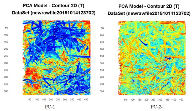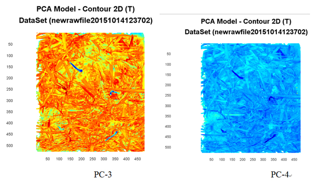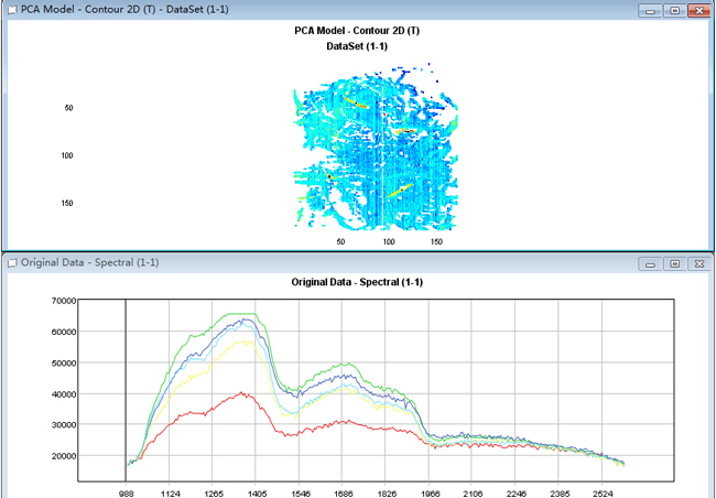 对扣除背景后的原始数据进行主成分分析(PCA),因高光谱图像的各个波段之间经常是高度相关的,它们的DN值以及显示出来的视觉效果往往很相似。主成分分析能够去除波段之间的多余信息、将波段的图像信息压缩到比原波段更为有效的少数几个转换波段的方法。