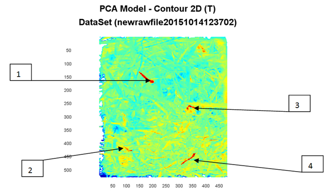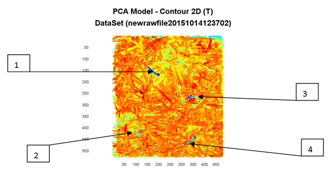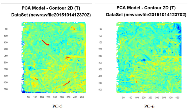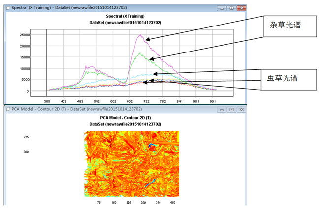 经过主成分分析、光谱平滑等算法处理之后,能够发现在主成分分析的1/6/7/8状态下对虫草的分类识别不是非常的精确,而在主成分分析的2、3、4、5状态下能够很好的将虫草和其他非虫草类的植被进行分开,测算精度非常高(在图PC-2 PC-3 PC-4 PC-5中虫草显示不同的颜色,这种颜色只是一个颜色显示,非虫草的本质颜色,只是为了区分区别)。