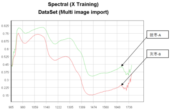 获取灰枣和骏枣的特征光谱,可以看出,两种栆的特征光谱位置基本一致,只是其光谱反射率会有一些差别。具体成因还需进一步分析。