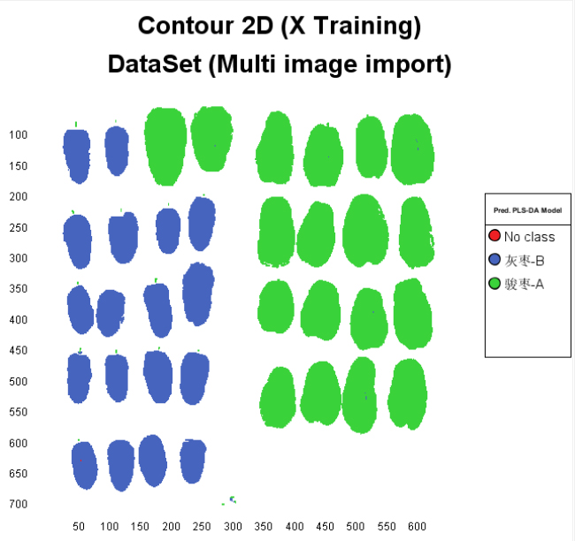 分别选取样本上的两个区域标注为骏枣-A和灰枣-B,以此为标样对其他样品进行归类识别。对已经划分出来的类别进行PLS-DA算法处理,评估划分出来类别成分。
