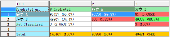 通过获取感兴趣的平均光谱,利用(SIMCA)分类法建立识别模型,对样本进行分类。预测骏枣-A所占比例为65.6%,灰枣-B所占比例为34.4%。