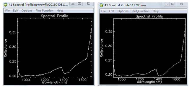 其次是噪声去除,常用的方法有小波降噪、S-G降噪、均值滤波、最小噪声分离等方法。本研究则运用国外较为常用的最小噪声分离方法(Minimum Noise Fraction Rotation, MNF)进行噪声去除。最小噪声分离工具用于判定图像数据内在的维数(即波段数),分离数据中的噪声,减少随后处理中的计算需求量。MNF本质上是两次层叠的主成分变换。第一次变换(基于估计的噪声协方差矩阵)用于分离和重新调节数据中的噪声,这步操作使变换后的噪声数据只有最小的方差且没有波段间的相关。第二步是对噪声白化数据(Noise-whitened)的标准主成分变换。为了进一步进行波谱处理,通过检查最终特征值和相关图像来判定数据的内在维数。数据空间可被分为两部分:一部分与较大特征值和相对应的特征图像相关,其余部分与近似相同的特征值以及噪声占主导地位的图像相关。由于此次采集的高光谱影像没有白板校正,因此数据预处理的第一步辐射定标没有进行分析处理,直接作MNF降噪分析。图3为MNF降噪前后的成像高光谱数据中DN值的变化。