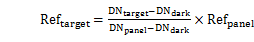 其中,Reftarget为目标物的反射率,Refpanel为标准参考板的反射率,DNtarget为原始影像中目标物的的数值,DNpanel为原始影像中标准参考板的数值,DNdark为成像光谱仪系统误差。