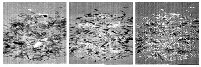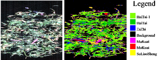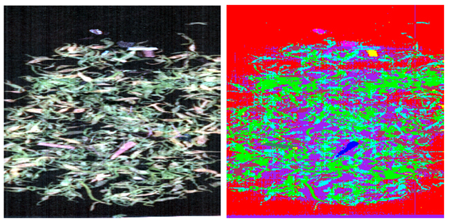图7为决策树的分叉图,主要运用了MNF变化的MNF2、3、4、5波段,以及高光谱图像数据的第15、80、104波段做决策树分类,该阈值是运用最大类间方差法获取。图8为利用该决策树的分类效果图,从图中可知,原图无法用肉眼识别的塑料绳、杂质等,运用决策树分类后能较为清晰的识别出来,而且图像处理速度大大提高。