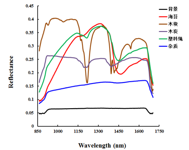 1、 海苔高光谱影像中各杂质的高光谱反射率