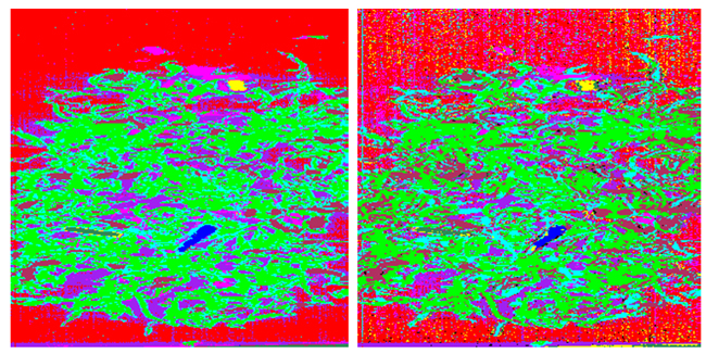 高光谱遥感图像分类是高光谱遥感图像分析和应用的重要内容,根据是否使用类别的先验知识,可分为监督分类和非监督分类,常用的监督分类方法有最大似然分类法、光谱匹配法和神经网络法等,非监督分类常用的方法有K-Means和ISODATA法。本研究运用监督分类方法中的最大似然分类法、神经网络法、光谱角匹配法来研究海苔、杂质、背景的区分,分类结果如图6所示。图6中绿色和紫色为海苔,红色为背景,其他颜色为杂质。从图6所知,这三种监督分类方法中,神经网络的分类效果最好,能识别出几种不同杂质,然而塑料绳并未清晰的识别出来,而且神经网络分类方法分类速度较慢,需要选择训练样本,费时费力,不利于产业化的应用。