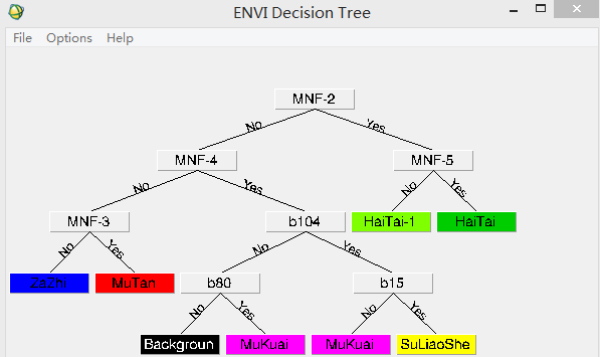根据2和3可知,运用MNF和监督分类方法虽然能较好地识别出海苔,但是单个MNF波段只能识别出少量的杂质,且位置杂质属性,监督分类虽然能识别较多的杂质,但是需要选择训练样本,且运行时间较长,并不适合未来产业化的发展。因为本研究探讨综合使用不同物质的光谱特征及其MNF波段,运用决策树分类方法快速识别海苔、杂质、背景。