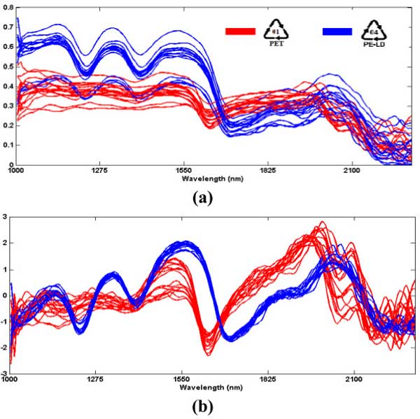 图3 PET and LDPE的光谱 (a) 预处理前,  (b) 预处理后