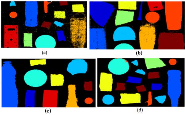 图4为利用支持向量机对经预处理后的图像进行的分类结果。图a和图b的 分类精度分别是 93.01% and 96.65%。图c和图d的分类精度是93.52%和96.90%。玻璃瓶的分类效果不理想是因为其的透明特性及镜面反射的缘故。