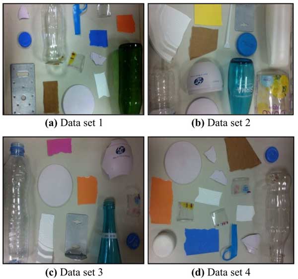 实验中使用的材料是金属部件,玻璃瓶子,纸板和纸张样品,以及塑料样品几种类型,即PET、HDPE、PVC、LDPE、PP和PS。每一种材料其颜色和形状均不一致,目的是检测模型的稳定性。
