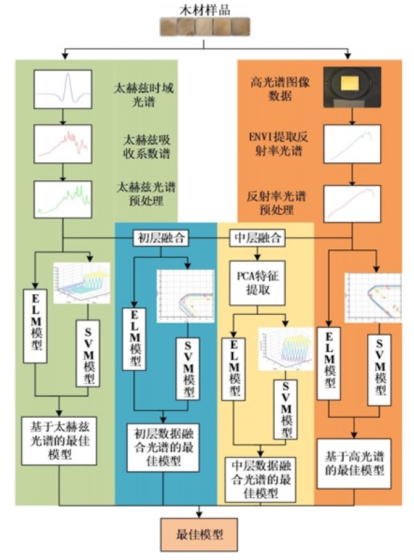 图3. 基于高光谱和太赫兹光谱结合数据融合技术的木材识别研究流程图