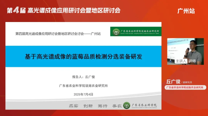 广东省农业科学院设施农业研究所丘广俊副研究员为大家带来《基于高光谱成像的蓝莓品质检测分选装备研发》的报告。报告主要介绍通过开发从高光谱图像中提取蓝莓光谱的图像自动提取算法,运用机器学习与数据预处理方法,基于漫反射光谱数据成功建立了可溶性固形物的定量回归模型。经过训练优化模型,模型预测均方根误差为0.4431°Brix, 模型决定系数为0.8655。研究分析结果表明,本研究提出的基于漫反射高光谱成像可以有效检测蓝莓内部品质指标,并利用成像技术实现了蓝莓可溶性固形物的可视化分布图。基于已建立的检测模型,研制了一套蓝莓品质检测分选装备样机,实现对蓝莓果实糖度级别自动化分级作业。