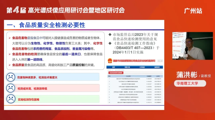 华南理工大学蒲洪彬副教授为大家带来《高光谱在食品品质快速检测的应用与深度学习研究》的报告。本报告简单介绍高光谱的原理和使用方法,重点汇报高光谱在果蔬、肉品等农产品原料品质和过程监控中的应用成果,并介绍人工智能在高光谱食品品质检测中的应用情况。