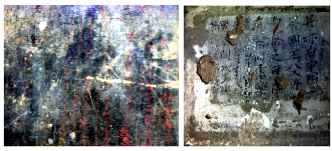 试验中的石碑分别由北京大学考古文博学院、山西博物院提供,石碑出土时石碑上有部分被土覆盖,对石碑表面覆盖的土层进行简单的剥离处理,可以看到石碑上有模糊的文字存在。