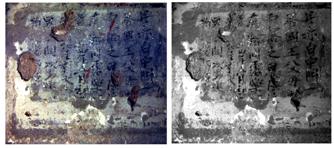 本文分析的对象由北大考古文博学院、山西博物院提供,如图 2 所示为使用高光谱成像相机拍摄的数据合成的真彩色图像。从图2可知,石碑里的文字有些已经风化变的模糊不清,难以用肉眼识别出来。