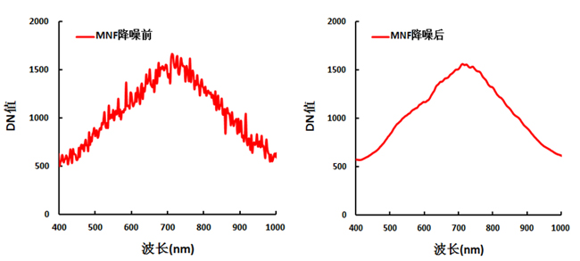 其次是噪声去除,本文运用国外较为常用的最小噪声分离方法(Minimum Noise Fraction Rotation, MNF)进行噪声去除。最小噪声分离工具用于判定图像数据内在的维数(即波段数),分离数据中的噪声,减少随后处理中的计算需求量。MNF本质上是两次层叠的主成分变换。第一次变换(基于估计的噪声协方差矩阵)用于分离和重新调节数据中的噪声,这步操作使变换后的噪声数据只有最小的方差且没有波段间的相关。第二步是对噪声白化数据(Noise-whitened)的标准主成分变换。为了进一步进行波谱处理,通过检查最终特征值和相关图像来判定数据的内在维数。数据空间可被分为两部分:一部分与较大特征值和相对应的特征图像相关,其余部分与近似相同的特征值以及噪声占主导地位的图像相关。由于此次采集的高光谱影像没有白板校正,因此数据预处理的第一步辐射定标没有进行分析处理,直接作MNF降噪分析。图7为MNF降噪前后的成像高光谱数据中DN值的变化。