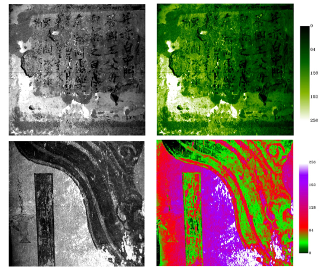 利用SpecView软件的Analysis-Animate功能,能快速浏壁画中的各波段图像的灰度变化,结果表明能较为清楚地识别壁画中字迹等高光谱影像信息的波段主要集中在红光与近红外区域,这与目前国内外的研究结果相同。以730 nm波段影像为例,对壁画730 nm处影像的灰度图作密度分割,以期能更清楚地分辨壁画内部成分的变化,如图9所示。从图9可知,通过对成像高光谱特定某一波段作密度分割并赋予不同的颜色,不仅在图像能较为清晰的看到壁画中各成分的变化,而且也能看到其在数值上的变化。