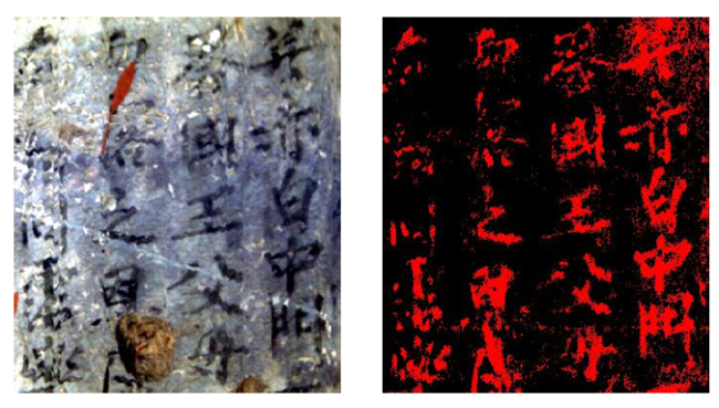 在自然界中,存在着许多同物异谱,异物同谱的现象,传统的非成像高光谱,对于异物同谱的现象很难将地物相互区别开来。但是随着遥感技术的发展,成像高光谱的“图谱合一”的特点为解决同物异谱,异物同谱的问题提供了技术支撑,本文壁画中的字迹与其背景的光谱十分相似,但基于成像高光谱“图谱合一”的特点,利用马氏距离法能较好地从背景中提取影像中的字迹,如图11所示。