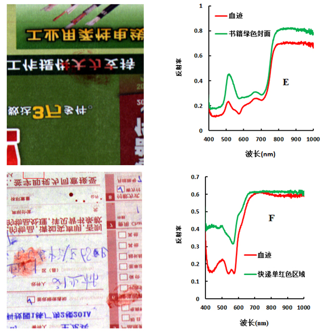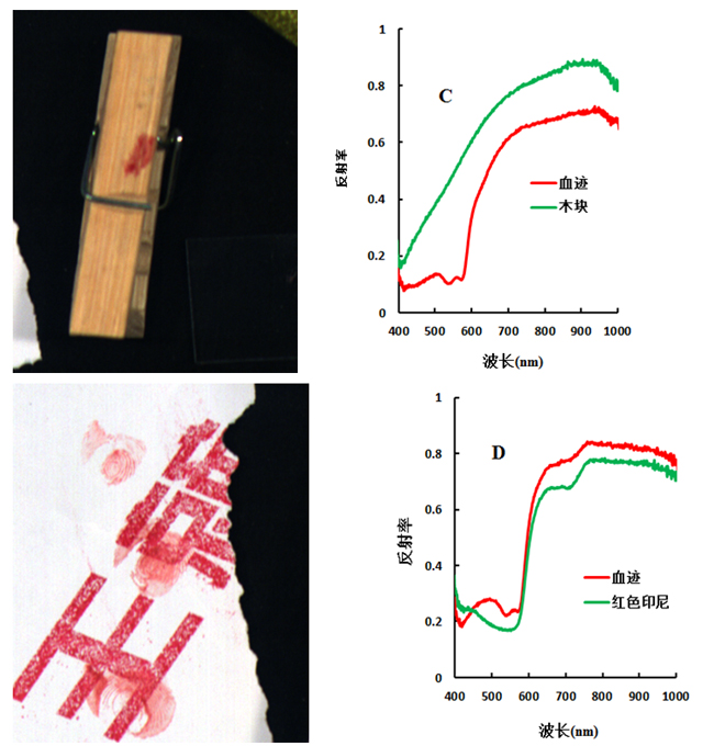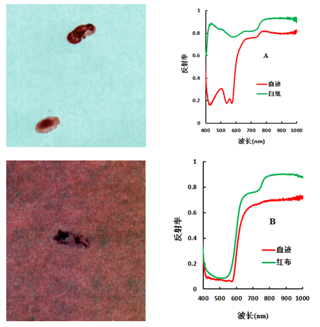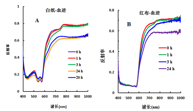 本实验利用成像高光谱技术,对白纸、红布、木块、红色印尼、书籍封面、快递单等六种介质上的血迹的进行分析,探讨其与不同介质上血迹的光谱差异,并分析白纸、红布上的血迹光谱反射率与时间推移的关系。研究发现这两种介质上的血迹随时间推移,在580-1000 nm,与死亡时间密切关系。这是由于死后呼吸及血液循环停止而导致细胞代谢异常、细胞膜结构异常、反应酶与蛋白质异常,加上实验环境中细菌的污染、血液渗透压和血液内 pH值变化作用于白细胞及补体成份而导致溶血。溶血过程使血红蛋白从细胞内释入血浆,吸光度相应的随之增加,从而反射率降低。由于时间和精力有限,本实验的研究成果仅供短期内的血迹陈旧度判断作参考,其余分析如想进一步了解欢迎随时与我们取得联系。