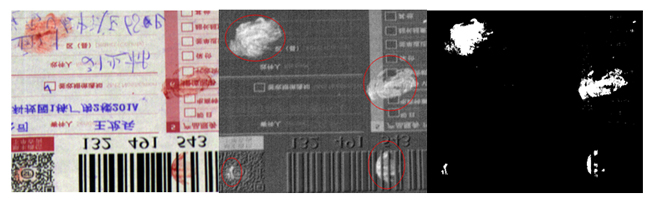 以快递单上的血迹为例,快速识别快递单上的血迹形态,如图6所示。根据快递单血迹的光谱特征与背景光谱特征的差异,构建差值指数,然后运用阈值分割算法获取血迹的位置的形态特征,如图6所示。
