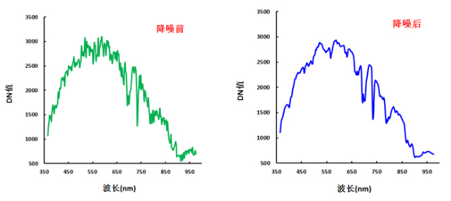 其次是噪声去除,本文运用国外较为常用的最小噪声分离方法(Minimum Noise Fraction Rotation, MNF)进行噪声去除。最小噪声分离工具用于判定图像数据内在的维数(即波段数),分离数据中的噪声,减少随后处理中的计算需求量。MNF本质上是两次层叠的主成分变换。第一次变换(基于估计的噪声协方差矩阵)用于分离和重新调节数据中的噪声,这步操作使变换后的噪声数据只有最小的方差且没有波段间的相关。第二步是对噪声白化数据(Noise-whitened)的标准主成分变换。为了进一步进行波谱处理,通过检查最终特征值和相关图像来判定数据的内在维数。数据空间可被分为两部分:一部分与较大特征值和相对应的特征图像相关,其余部分与近似相同的特征值以及噪声占主导地位的图像相关。由于此次采集的高光谱影像没有白板校正,因此数据预处理的第一步辐射定标没有进行分析处理,直接作MNF降噪分析。图8为MNF降噪前后的成像高光谱数据中DN值的变化。
