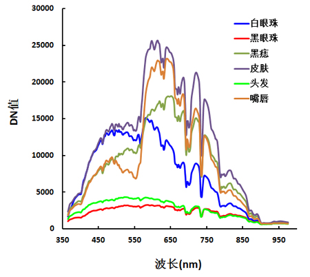 图8 人脸上各目标物在350-1000 nm范围内的DN值变化