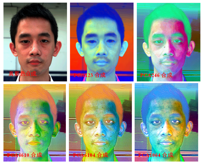 经主成分变换后,各主成分间相关性较小且包含较多的图像信息,因此可以通过波段间的组合更清晰地识别各目标物。图11为原始图像的真彩色合成及各主成分变换的假彩色合成。从图11可知,PCA假彩色合成,并不是主成分越靠前,其合成图中各目标物显示就越清晰,而是根据在各主成分中较为清晰地识别目标物的主成分进行彩色合成。根据图10可知,第4、6和10主成分能较为清晰地人脸黑痣的分布情况,因此运用4、6和10三个主成分构建的假彩色合成能较为清晰识别人脸黑痣的分布范围。