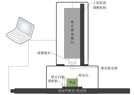 GaiaSorter “盖亚”高光谱分选仪的核心部件包括均匀光源、光谱相机、电控移动平(或传送带)、计算机及控制软件等部分。工作原理是通过光源照射在放置于电控移动平台(或传送带)上的待测物体(样品),样品的反射光通过镜头被光谱相机捕获,得到一维的影像以及光谱信息,随着电控移动平台(或传送带)带动样品连续运行,从而能够得到连续的一维影像以及实时的光谱信息,所有的数据被计算机软件所记录,最终获得一个包含了影像信息和光谱信息的三维数据立方体。其结构示意如图4所示。