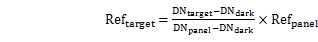 其中,Reftarget为目标物的反射率,Refpanel为标准参考板的反射率,DNtarget为原始影像中目标物的的数值,DNpanel为原始影像中标准参考板的数值,DNdark为成像光谱仪系统误差。