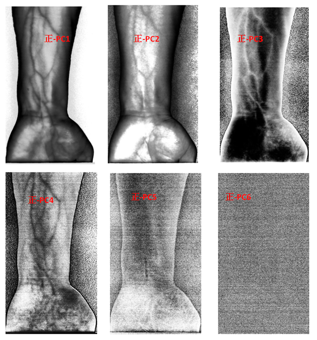 为了客观地识别手臂上的静脉,对经预处理后的高光谱数据进行主成分分析(Principal Component Analysis, PCA),去除波段之间的多余信息、将多波段的图像信息压缩到比原波段更有效的少数几个转换波段下。图9为手臂正反面经PCA变换后的前6个主成分。